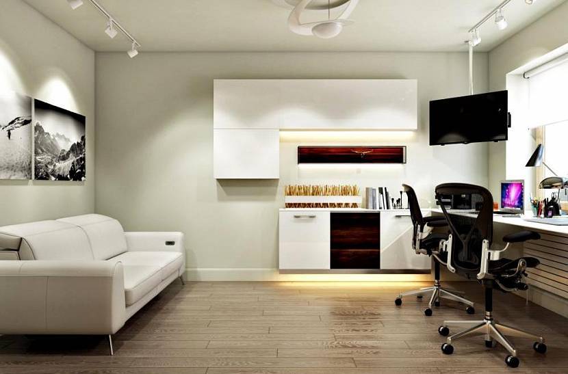 Дизайн кабинета в стиле минимализм – это уже современная классика, которую нельзя обойти своим вниманием. Такой кабинет подразумевает следующее:. – дизайн кабинета должен быть экономичен, эргономичен, рационален и прост; – никаких лишних элементов, полки и шкафы могут стать частью стен и закрываться от лишних глаз; – минимализм в работе – это максимальная эффективность, все по делу, ничего не отвлекает; – выберите светлые обои или покрасьте светлой краской стены, нужно создавать глубокие цветовые акценты; – сочетайте дороговизну и функциональность при выборе мебели, это придаст вашему кабинету особый стиль; – интересная деталь – контрастная полка длиной во всю стену