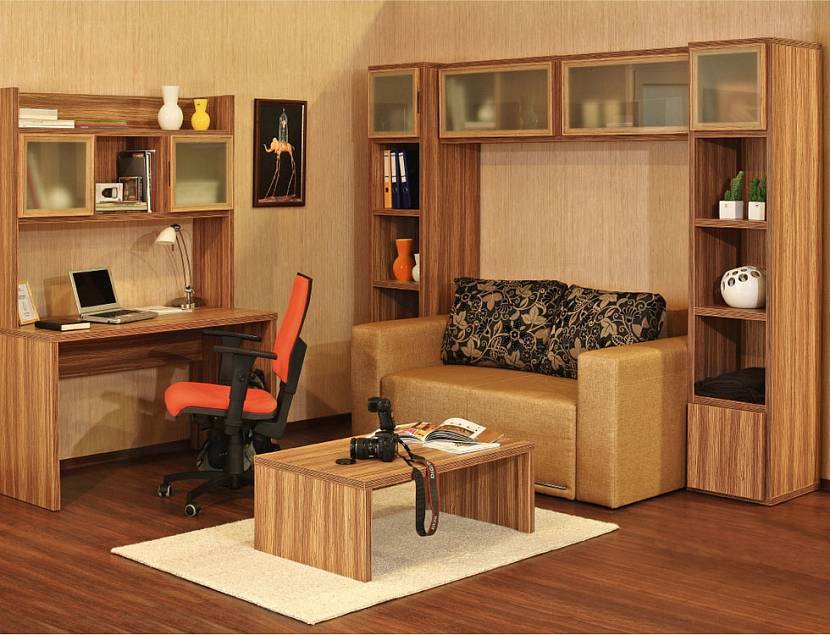 Чаще всего такие кабинеты оборудуют в гостиных и спальных комнатах. Для того чтобы отделить рабочую зону от остального пространства подойдут перегородки, например ширмы или раздвижные двери. Мебель включает в себя только самое необходимое: стол, кресло и несколько полок или выдвижных ящиков. Для еще большей экономии места можно использовать раскладывающийся стол.