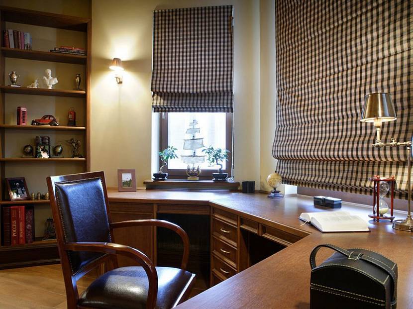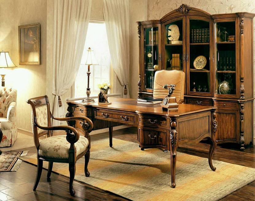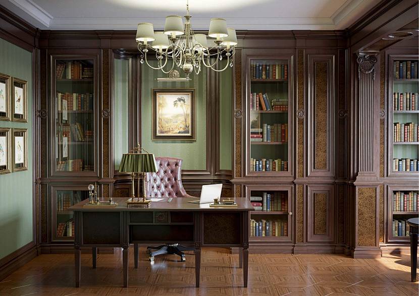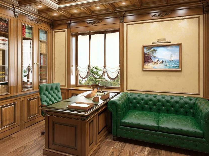 Если это кабинет главы корпорации, то он непременно должен впечатлять клиентов и всем своим видом говорить о процветании бизнеса и высоте положения своего хозяина. Оптимально оформить его в духе бессмертной классики, предполагающей применение исключительно натуральных и высококачественных материалов, и наполнить помещение изысканными элементами декора.