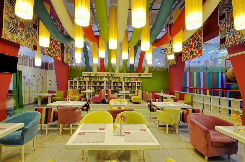 Если заведение предназначено для отдыха с детьми, нужно создать веселый интерьер с игровыми зонами, ведь дети быстро кушают, чтобы успеть поиграть и повеселиться.