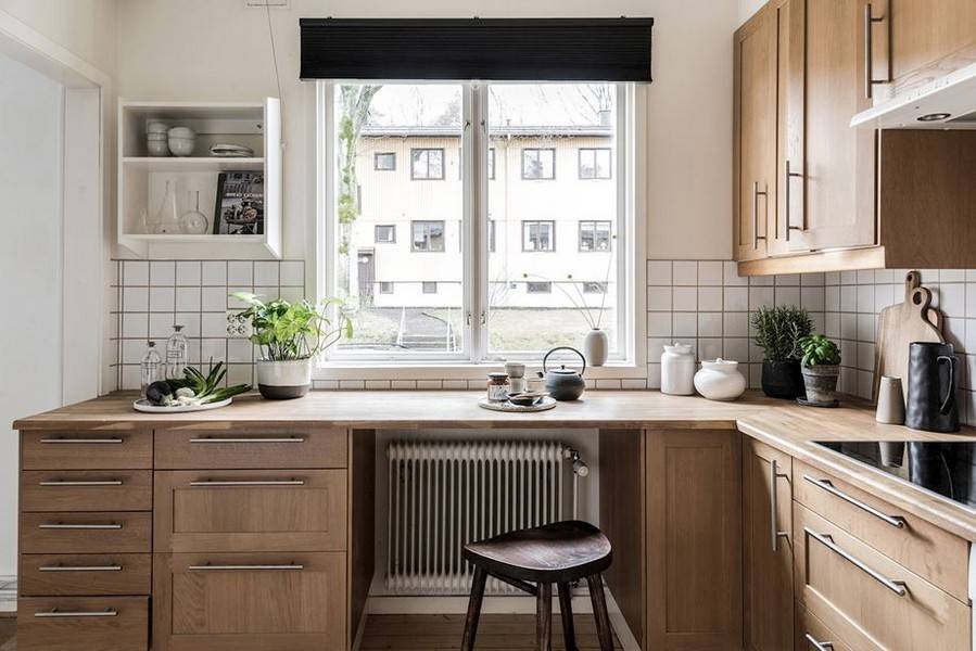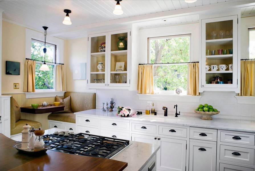 Материалы и цветовую гамму для отделки и мебели подбирают исходя из выбранного направления. Например, для английских пекарен характерна натуральная цветовая гамма в коричневых тонах без ярко-выраженных оттенков. Цвета выпечки и натурального дерева сделают кухню уютной и теплой.