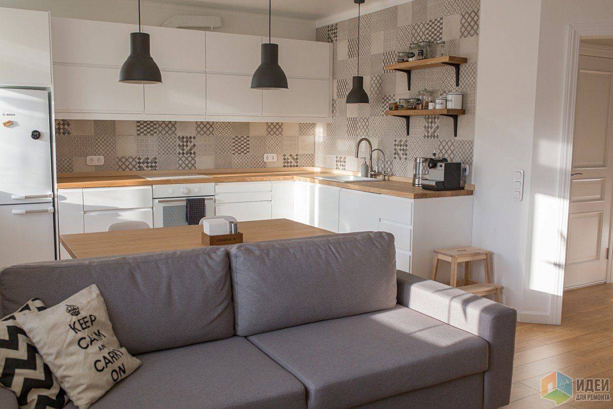 Обратите внимание на лампы, кухонные принадлежности, а также табуретки и стулья. Благодаря их правильному выбору, сочетание классической и современной кухни-гостиной может выглядеть как на картинке