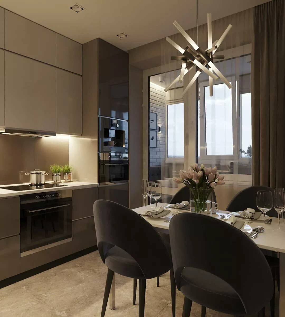 Это могут быть, например, коричневые обои на кухне или кухня с коричневой столешницей. Следует помнить, что слишком тёмные обои визуально уменьшают помещение.