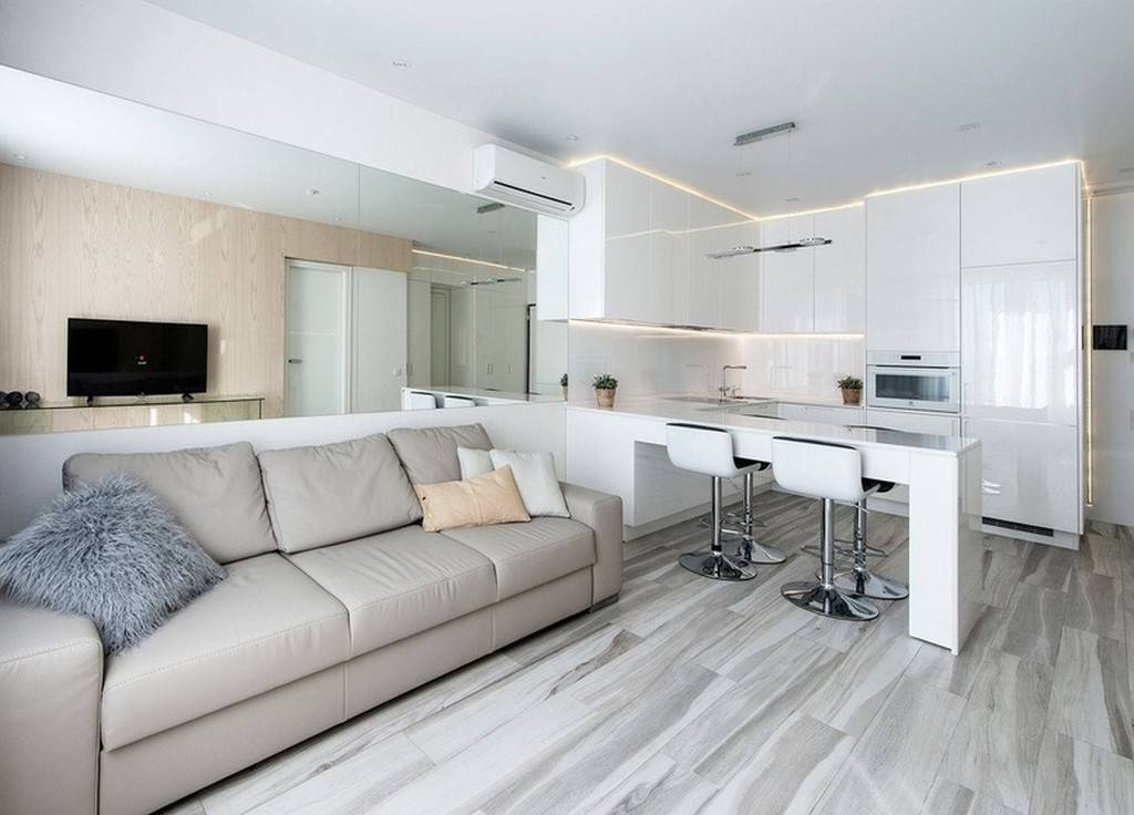 Чтобы сделать зал удачной комбинацией гостиной с кухней и столовой, стоит выбрать элементы дизайна интерьера, которые будут общими для всех частей. Эффект легче всего достичь с помощью цветов. Выберите тему и постарайтесь подобрать аксессуары для гостиной, кухни и столовой одного цвета в разных оттенках
