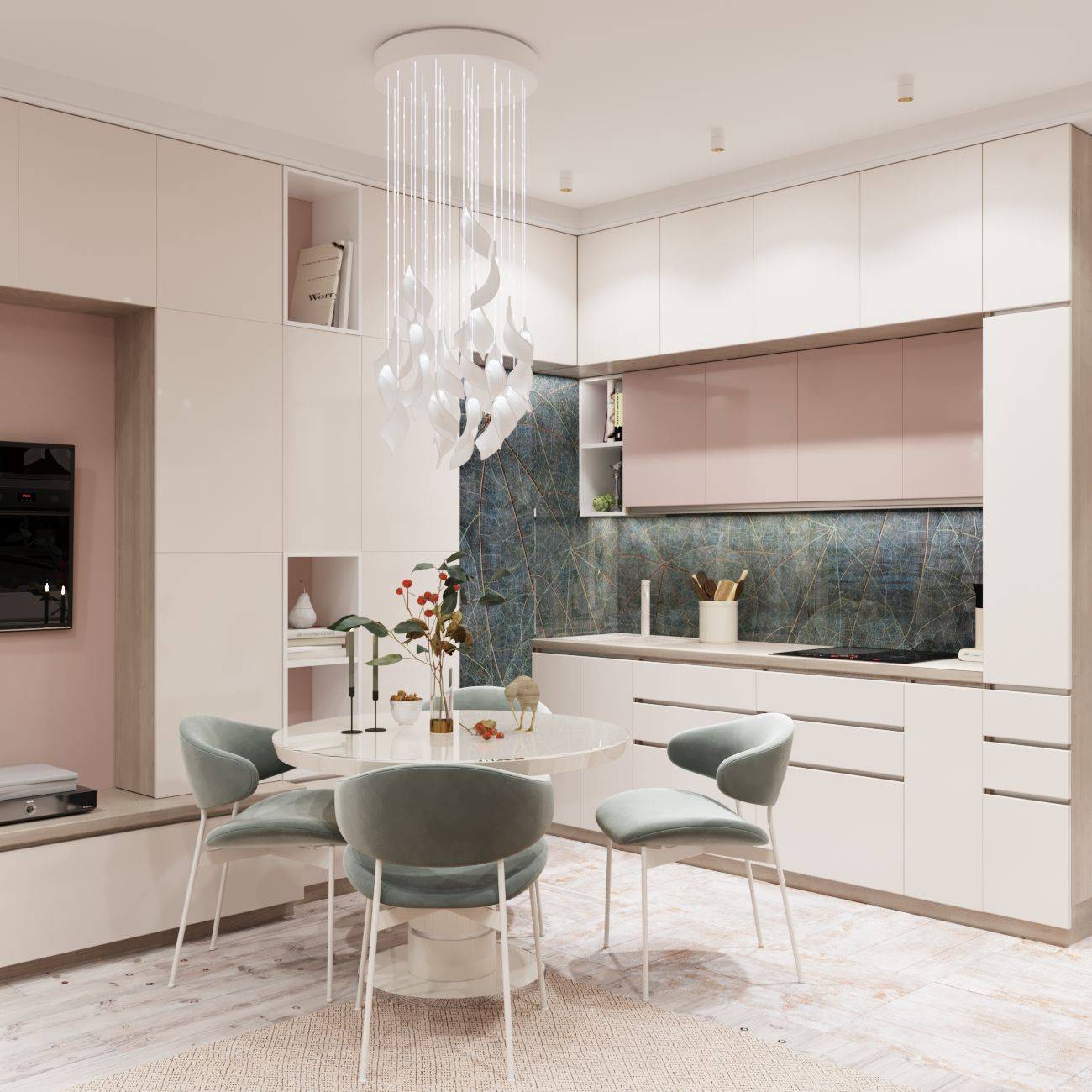 Кроме того, рекомендуется сочетать от 3 до 5 оттенков для создания динамичной и просторной комнаты, в которой, кстати говоря, благодаря этому допущению, легко расставить акценты. Например, оформить наиболее насыщенным тоном фартук, разместить сочный немногочисленный декор или же повесить эффектные светильники.