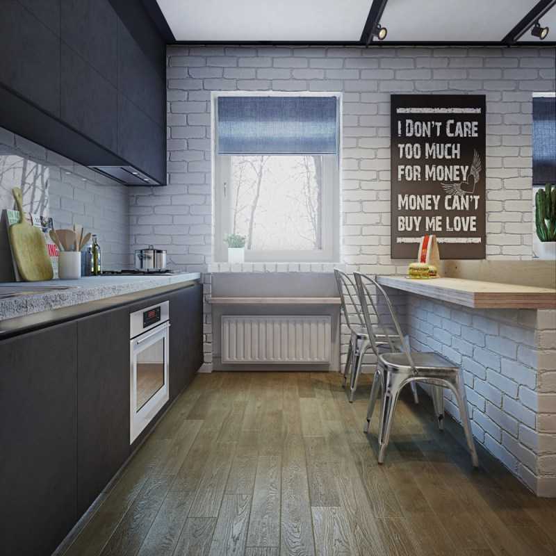 Если есть намерение оформить небольшую кухню таким образом, то следует учитывать то, что мебель и гарнитур должны быть компактными и выступать от стены на минимуме своих возможностей, иначе есть риск создать психологически неприятную «клетку».