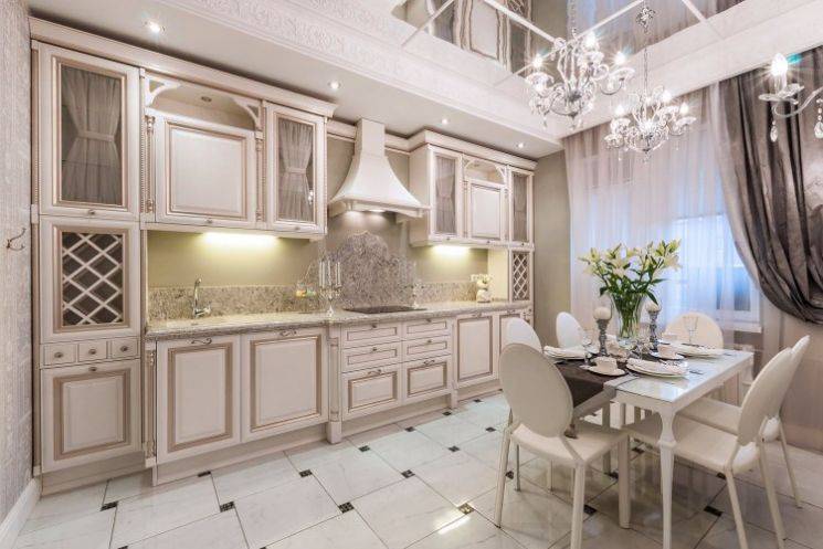 Периметр средней по размеру кухни можно увеличить с помощью глянцевых поверхностей, зеркал, керамики, светлых фасадов гарнитура. Мебель, изготовленная из прозрачного пластика, стеклянная поверхность столешницы обеденного стола, стулья, табуреты из прозрачного акрила визуально воспринимаются как невесомые.