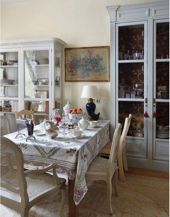 В интерьер включается старая и антикварная мебель. Украшение лоскутными одеялами, скатертями и салфетками ручной работы, удобные подушечки, рукодельницам это направление дает полностью себя проявить.