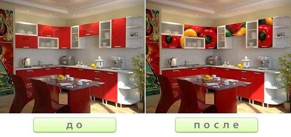 Гарнитур с фото печатью, изготовленный в заводских условиях, отличается более качественным и долговечным изображением. В основном изображение печатают на хорошей пленке, которую наклеивают на фасады из различных материалов, а затем обрабатывают края таким образом, чтобы под пленочный слой не попадали ни пыль, ни жир, ни вода. Оптимально, чтобы самоклеющаяся пленка была покрыта сверху еще и лаком, тогда она будет более долговечной.