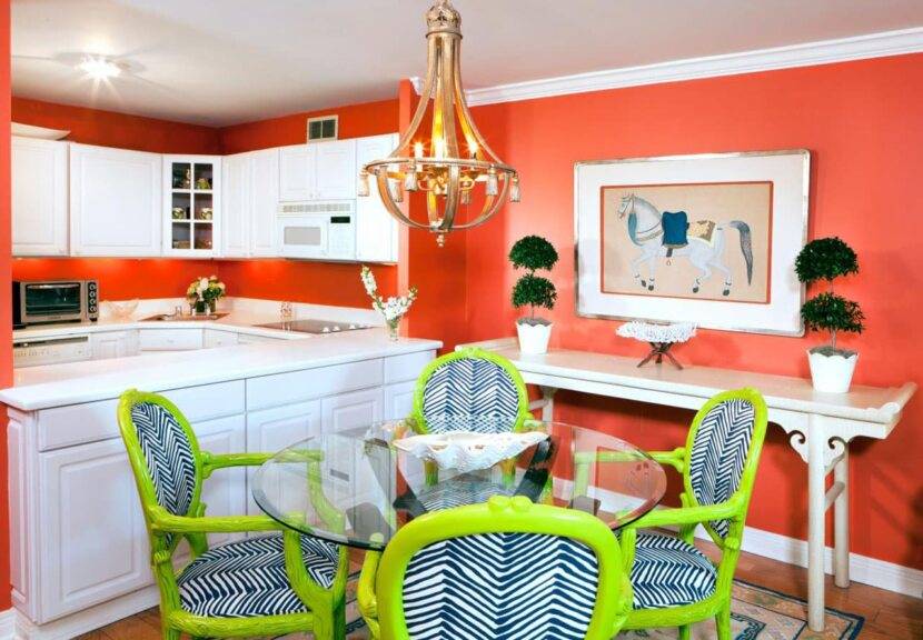 Роль акцента может играть любой предмет мебели или его элемент, как то столешница или чехлы для стульев. Также яркие нотки привнесет посуда или текстиль.