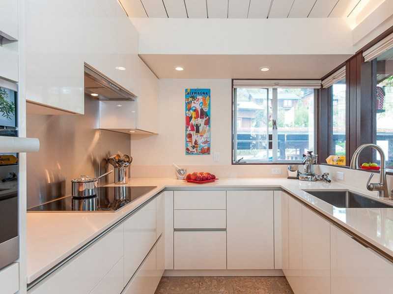 Отличительный характер расположения состоит в П-образном виде, когда под рабочую площадь задействованы 3 стены единым течением гарнитура и техники.