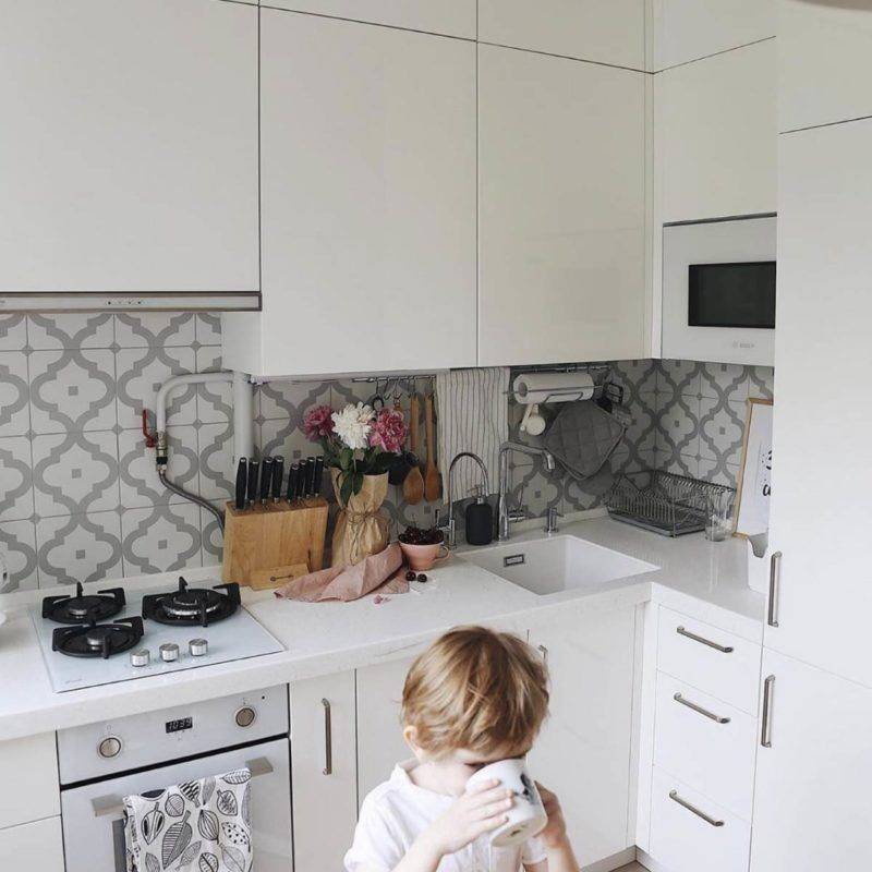 Плитка в стиле пэчворк на фартуке или на полу и минималистичный белый гарнитур – самое беспроигрышное сочетание