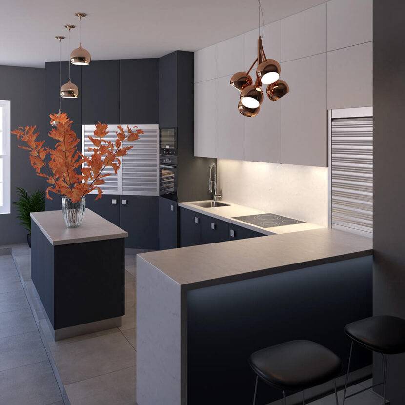 Во-первых, исходя из размеров, всегда возникают определенные ограничения, которые важно учитывать. К примеру, для маленькой кухни вам стоит брать гарнитур со светлым фасадом и темными перегородками, которые зрительно будут вытягивать пространство.