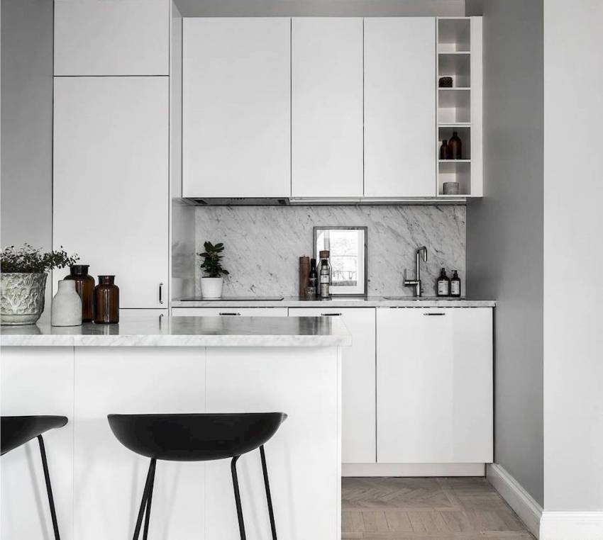 Гамма белого, как и другие светлые выбеленные тона, освежает кухню и визуально делает ее более просторной. Чтобы добиться максимального эффекта, можно выполнить в этом цвете не только отделку, но и подобрать соответствующий гарнитур.