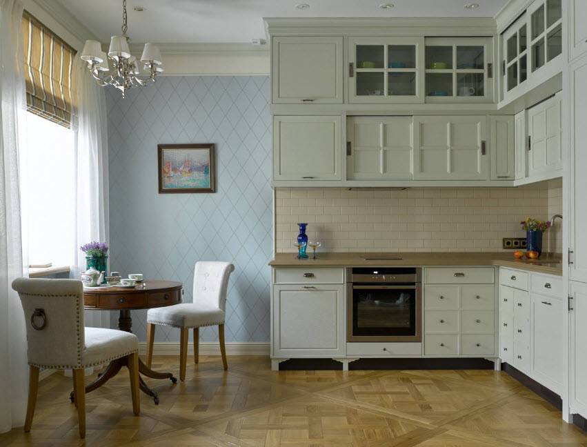 Этот бюджетный вариант мебели, цена которой существенно отличается от подлинных антикварных столярных изделий, идеально подходит для обустройства кухни в светлых тонах, олицетворяющих индивидуальные черты классического стиля дизайна.