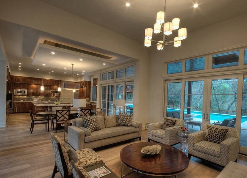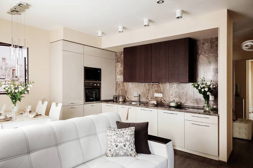 Планировка маленькой кухни с темной гостиной потребует особенного освещения. На кухне чаще всего есть окна, через которые проникает дневной свет. До зала он не доходит, поэтому следует поставить там яркие лампочки. Точечное освещение для кухни-гостиной — это лучший вариант.