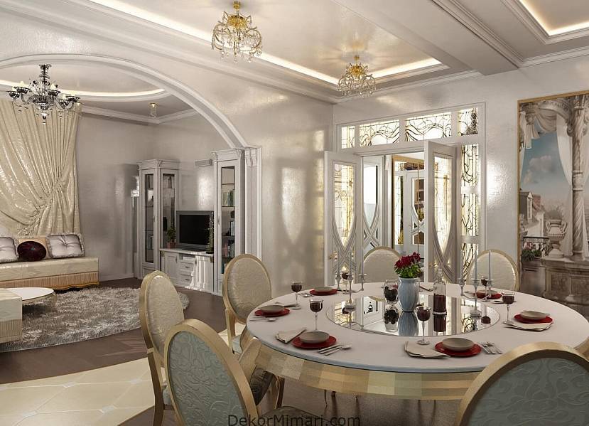 Для обустройства обеденной зоны будет правильным остановиться на круглом раздвижном столе. Тандем с ним должны составлять стулья с высокими мягкими спинками.