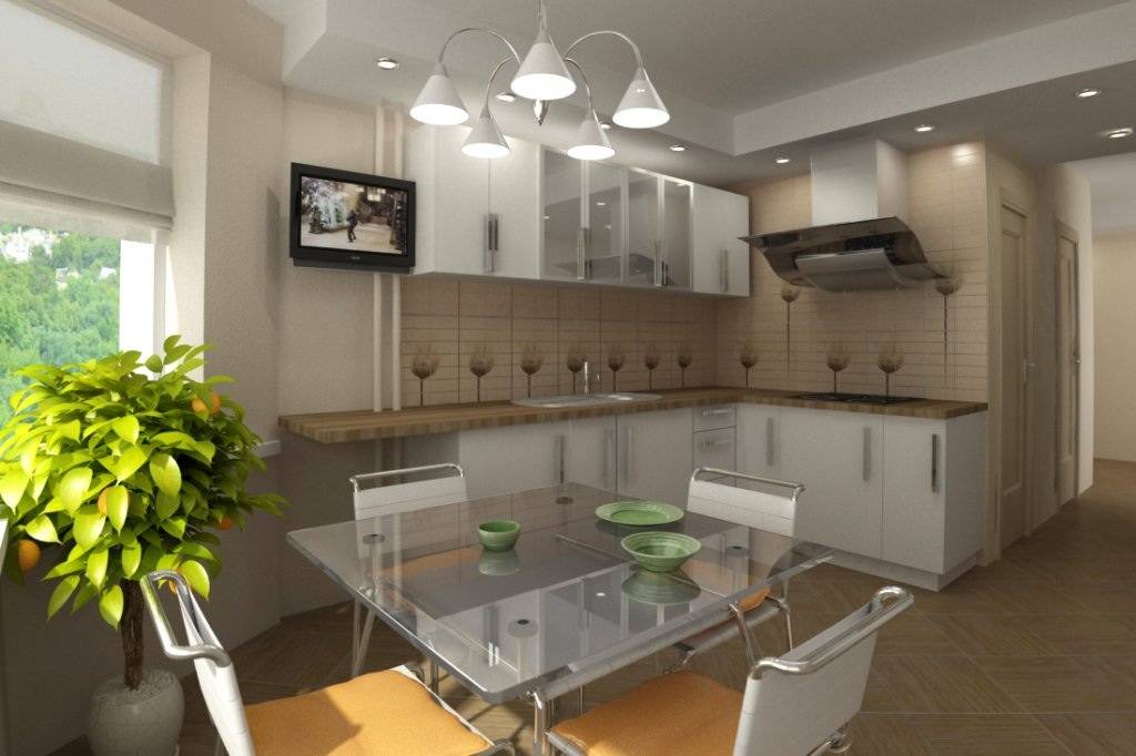 Самый простой вариант планировки – традиционная обеденная группа у окна с гарнитуром, расположенным по Г-образной или параллельной схеме.