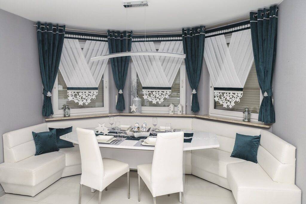 Современный вариант дизайна обеденного уголка допускает использование различных вариантов декора, в том числе применение тюля с портьерами, применение римских штор, английских занавесок