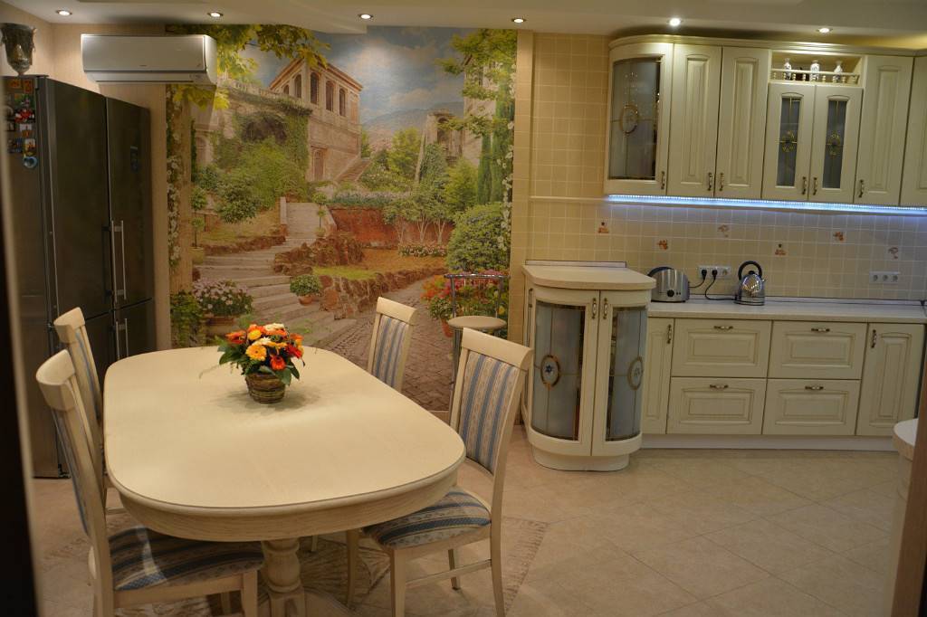 Также для них подойдут изображения с видом из окна или выходом в дверь. В большой кухне можно применить прием симметричного расположения фрагментов, выдерживающих общую тему панорамы. Хорошо смотрятся всевозможные пейзажи: морские, деревенские, городские, натюрморты и различная флора.