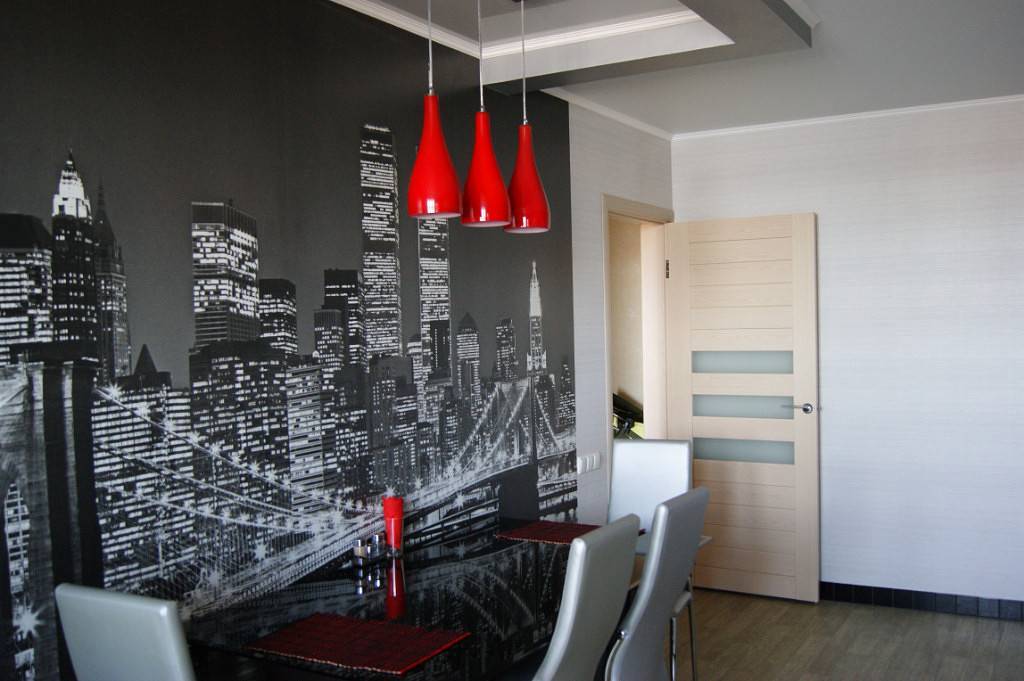«Монохромные интерьеры и строгий черно-белый фон отлично дополнит яркое цветовое пятно в виде фотообоев, появившихся на кухне»