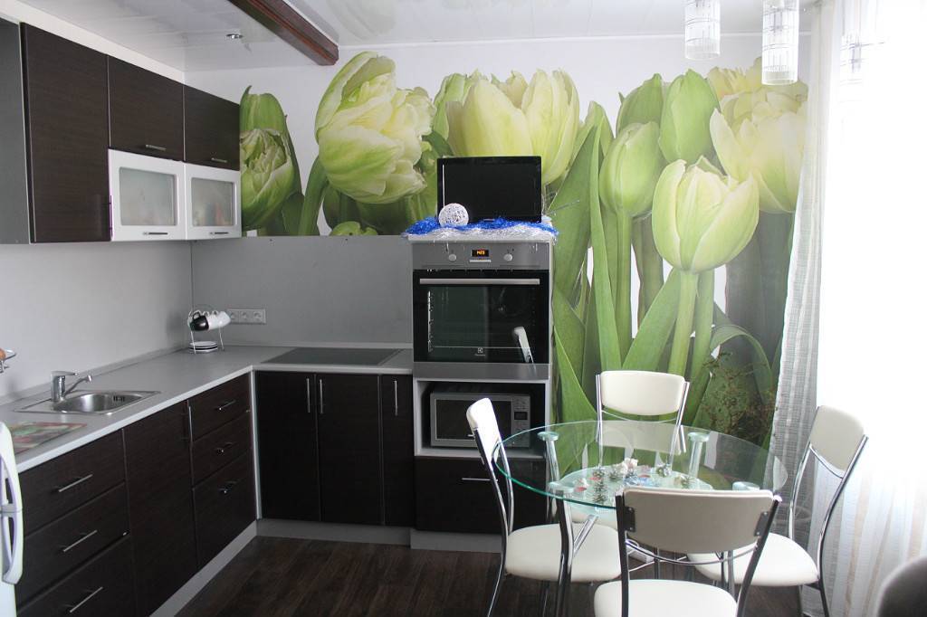 В отделке современных кухонь дизайнеры используют следующие виды фотообоев: