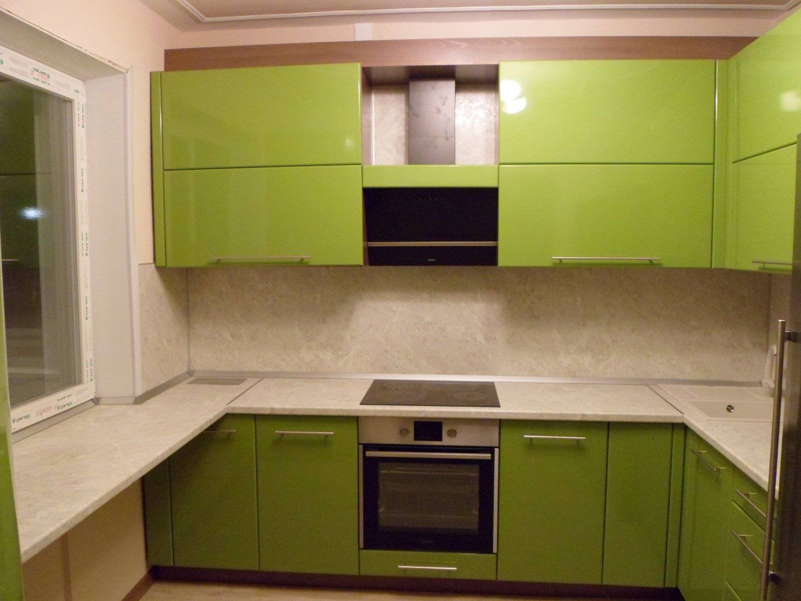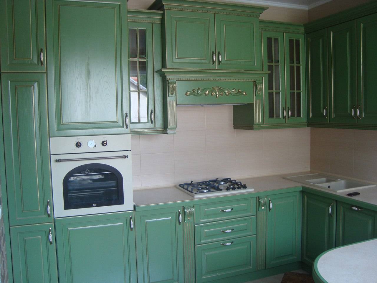 Что касается сочетаний с другими цветами, то эффектно всегда выглядит сочетание зеленого с белым (фартук, шторы, столешница). Хорошо смотрится темно-зеленый в формате — зеленый низ и светлый верх.