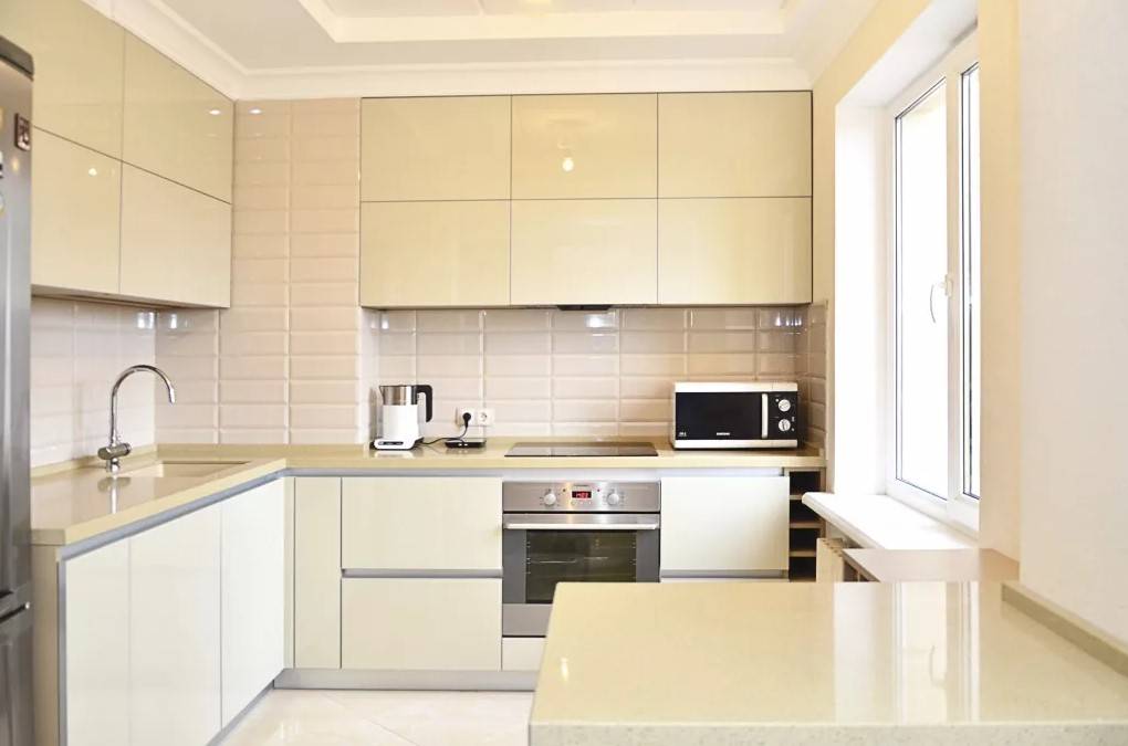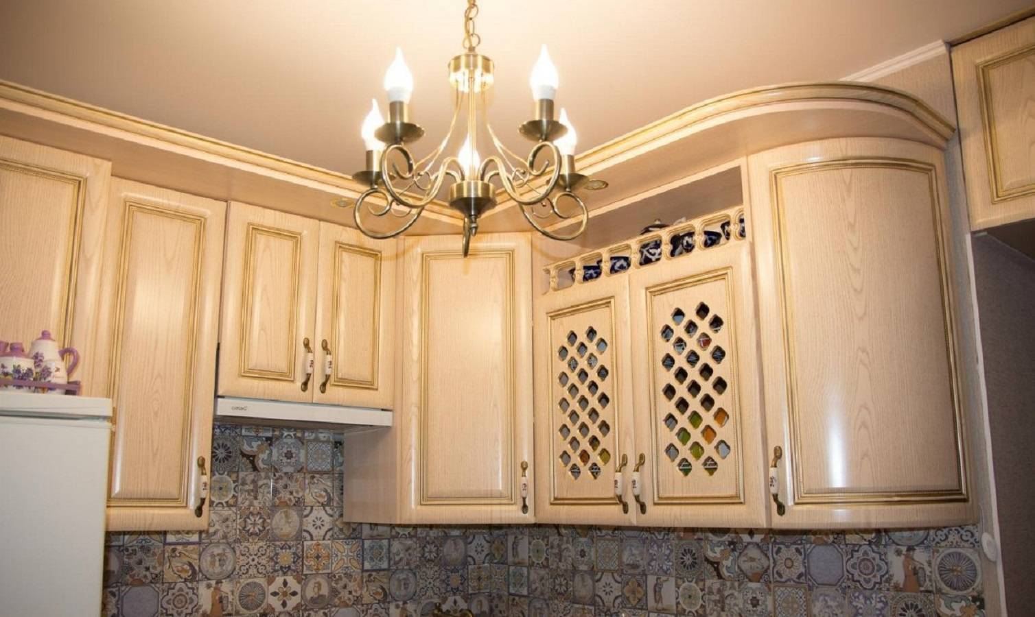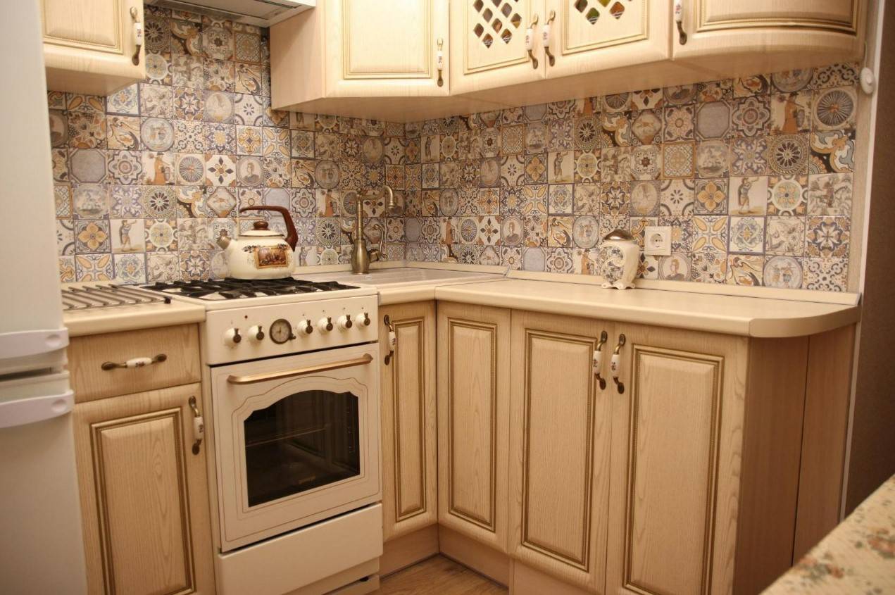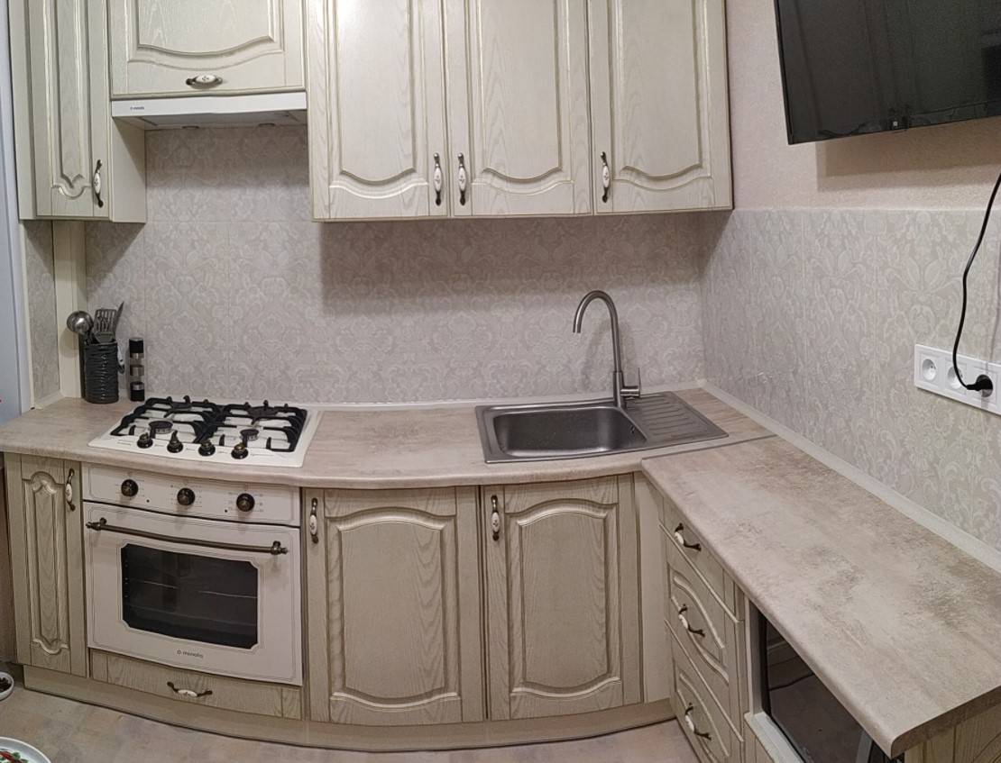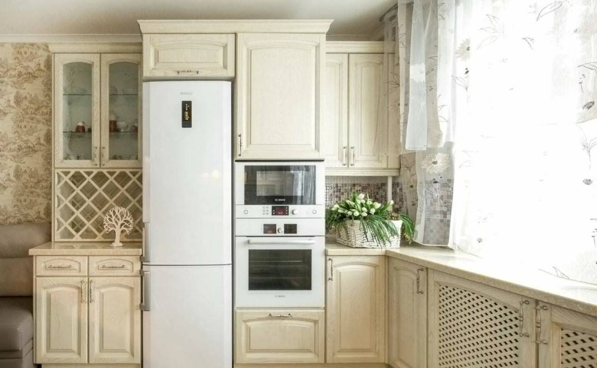 Хотите применить классику в типовой кухне хрущевки? Тут от крупногабаритной мебели придется отказаться. Впрочем, кто сказал, что бежевый угловой гарнитур выглядит плохо? Выбирайте модели с золотистой патиной на фасадах – они выглядят дорого и изысканно.