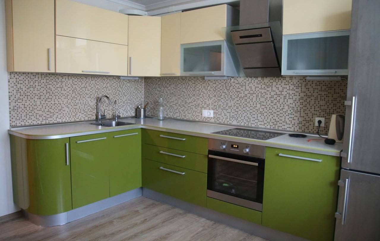 Свежий зеленый отлично подчеркнет изысканность бежевой мебели. Кстати, пол советуем сделать темнее – тогда кухня будет казаться выше.