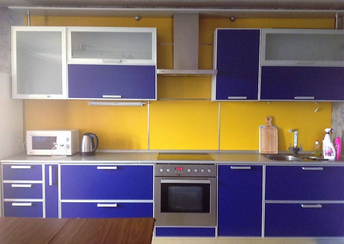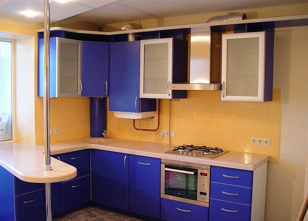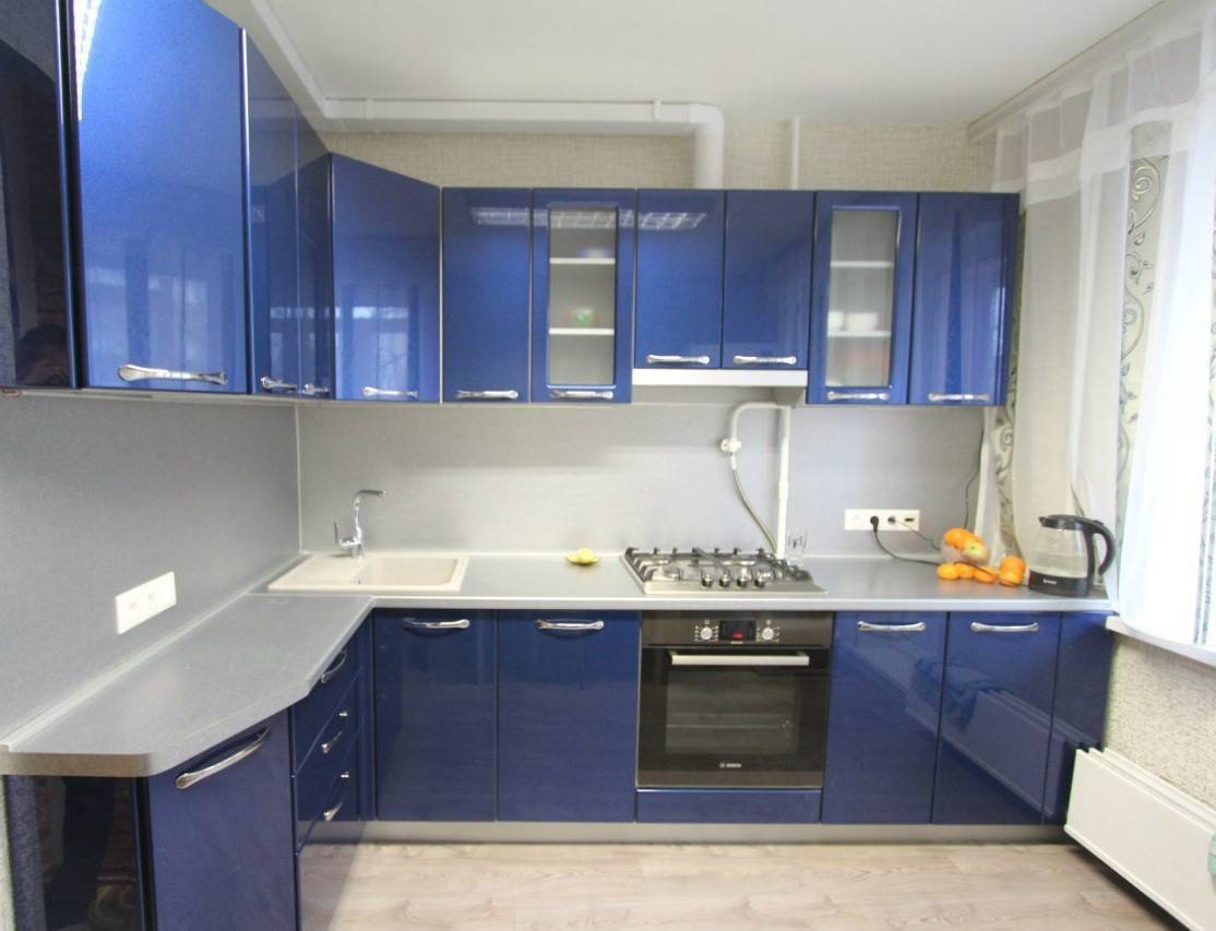 Более жизнерадостным сделают интерьер оранжевые и желтые стены. Для любителей более строгого холодного интерьера сочетать синий гарнитур можно с серыми стенами, гранитовым фартуком, серебристыми шторами. Такие сочетания — приоритет современных стилей, отражающих технологичность используемого кухонного оборудования.