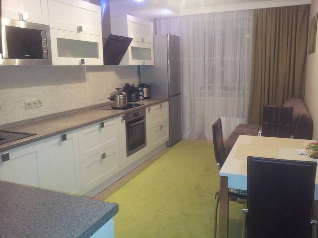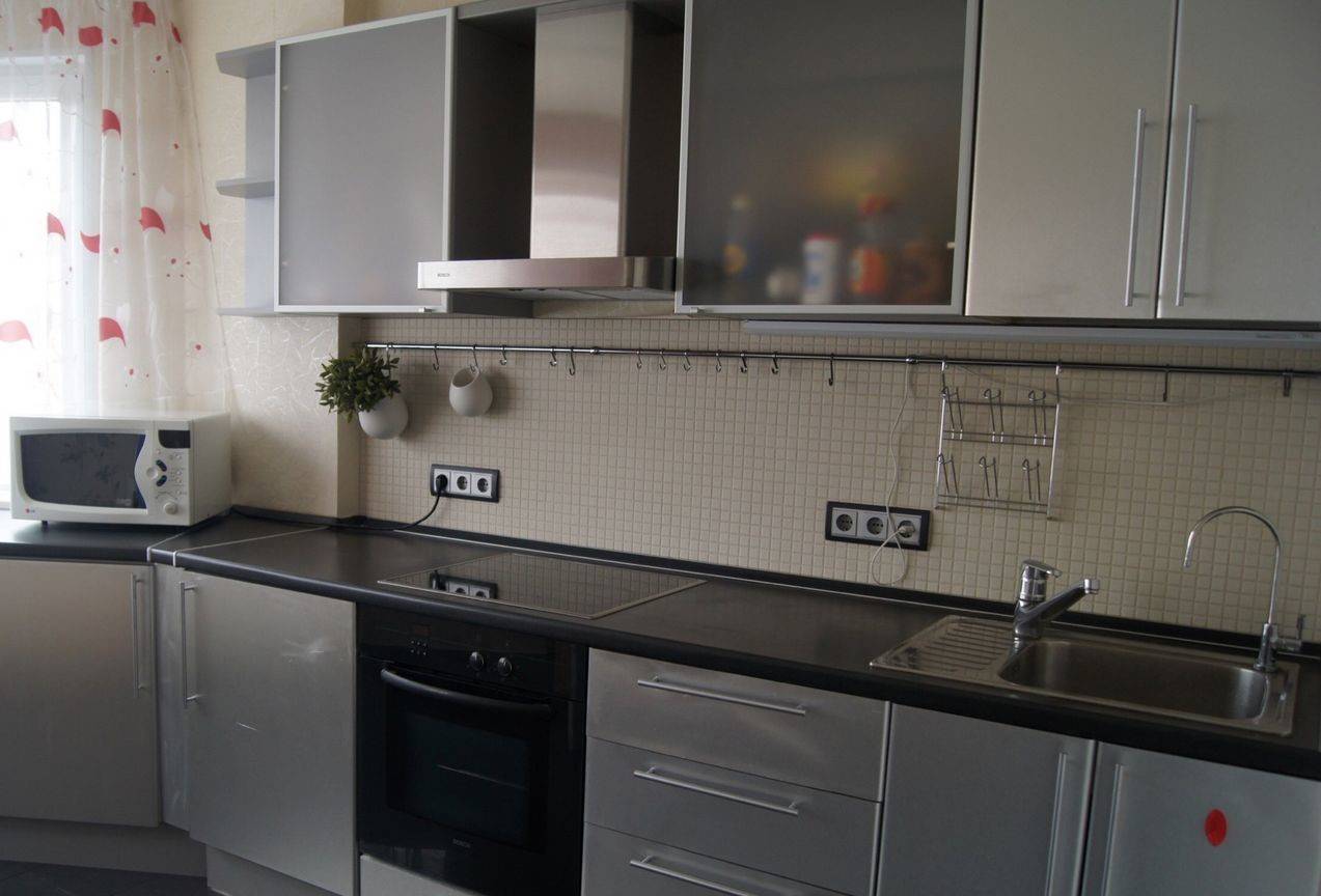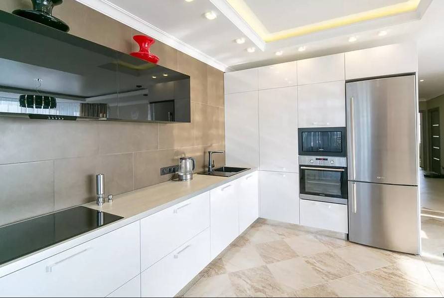 Наилучшим вариантом является контрастная черная техника или серебристые бытовые приборы. На кухне также вполне допустимы яркие акценты, например в виде красной вытяжки или холодильника.