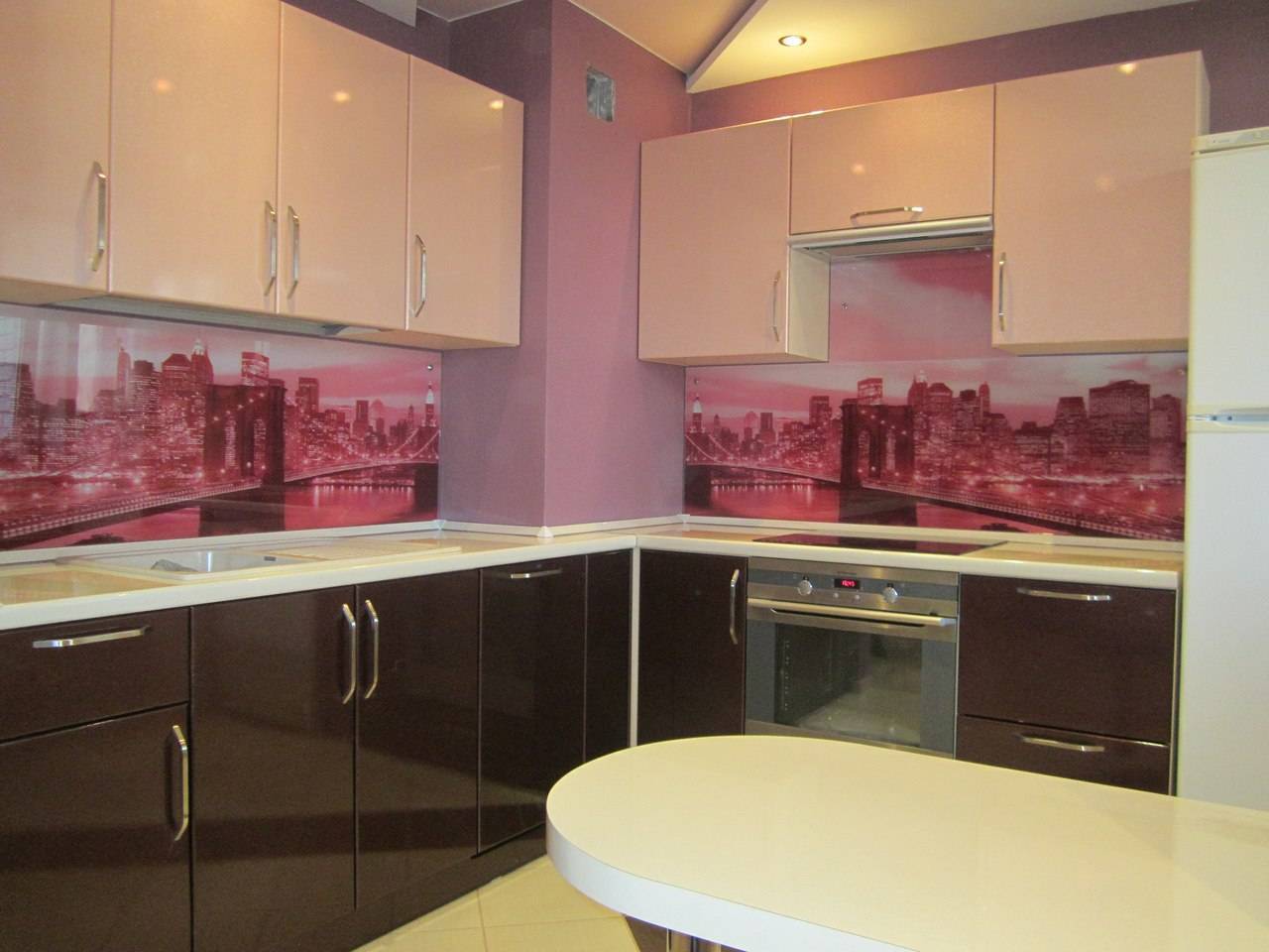 Отличный вариант для обустройства кухни — выполнить только нижние или только верхние фасады кухни в фиолетовых тонах. Остальная часть может быть белой, серой, лиловой. Что касается материала изготовления такого гарнитура, то тут следует руководствоваться выбранным стилем интерьера.