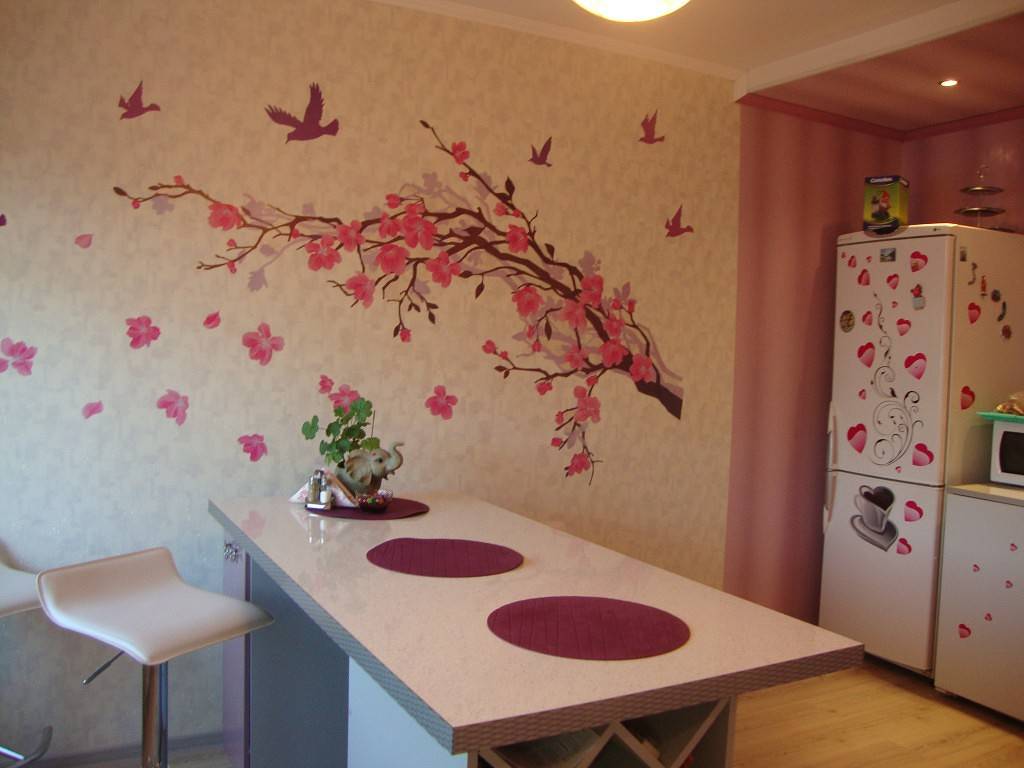 Обязательно присутствуют растительные мотивы: в виде рисованной флористики или живых растений на подоконнике, полочках или обеденном столе.