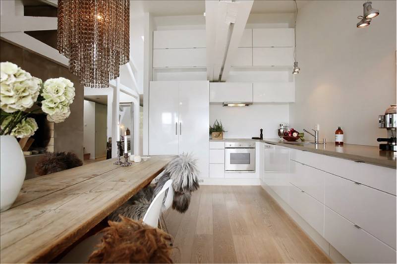 Например, глянцевая белая кухня на фоне кирпичной белой стены с белым стеклянным фартуком будет выглядеть очень стильно и совсем не как операционная.