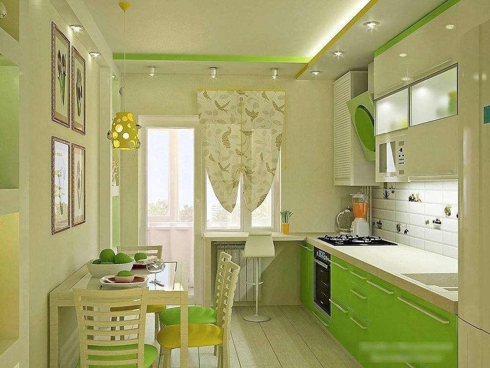 - Если большие пространства могут оформляться в любой гамме, то маленькие кухни – только с преобладанием светлых оттенков. Например, кухня может быть белой, а стены салатовыми. Или наоборот: кухня в зеленом цвете, а стены в белом. Если это зеленые обои, то они должны иметь ненавязчивый рисунок, который «не съест» пространство (фото ниже).