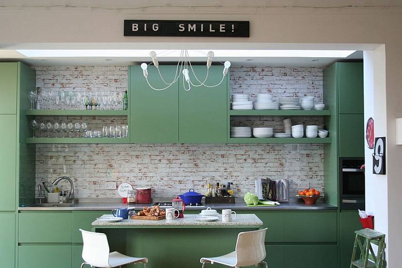 Кухонные стены можно и даже нужно оформлять, используя эту гамму. Но проявите смекалку и фантазию, не заклеивайте всю комнату однотонными яблочно-травянистыми обоями. Используйте сочную салатовую плитку в виде фартука над рабочей зоной, а остальные стены оформите, к примеру, фактурой дерева или кирпича, или бежевыми обоями.