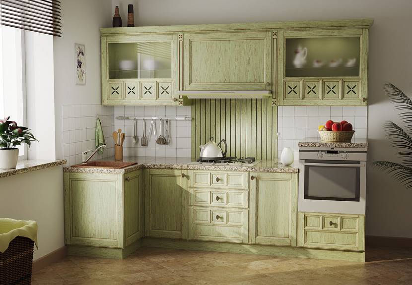 Роспись на колпаке вытяжки, на стенах несколько натюрмортов в зелёной гамме, в рамах с белыми паспарту. Белая и зелёная керамика завершат образ кухни в стиле прованс.