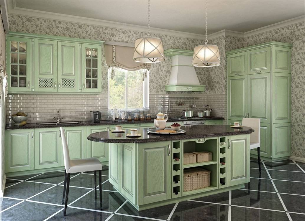 Если кухонный гарнитур зеленого оттенка и при этом какими должны быть пол и стены.