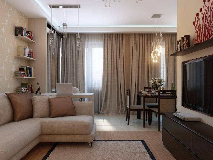 Вариант первый: кухня-столовая-зал плюс спальня. Наиболее оптимальный вариант для молодой семьи, состоящей из двух человек. Суть дизайна: совместить кухню и зал, а в самом зале расположить место под обеденный стол. Спальню (кровать) можно оградить конструкцией из гипсокартонных листов, полкой, шторами, гардинами.