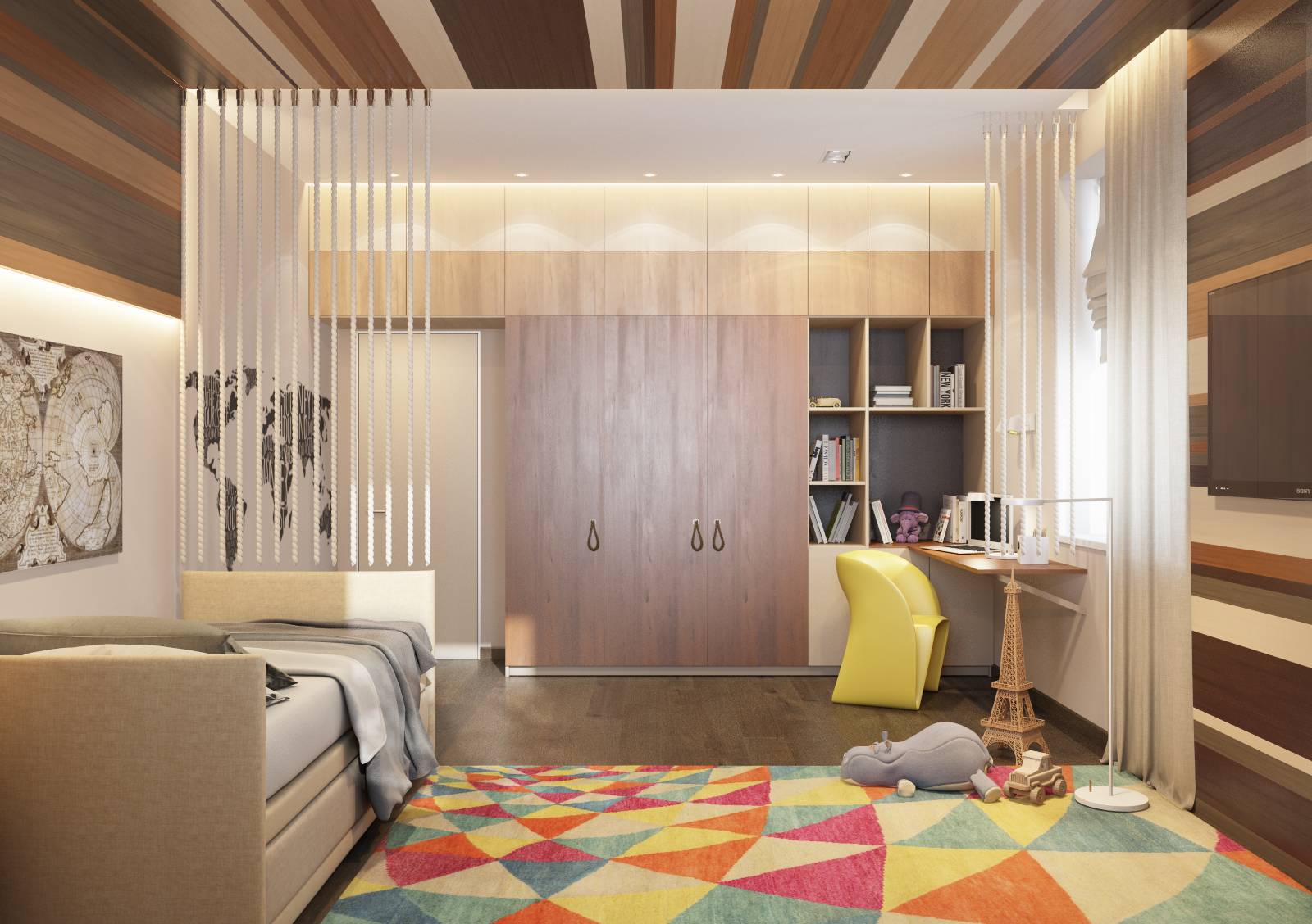 Небольшая студия является прекрасным решением для семьи с ребенком. С помощью грамотной организации пространства, получается обустроить уютный детский уголок с определенным дизайном и отделить его от остального помещения за счет разнообразных перегородок.