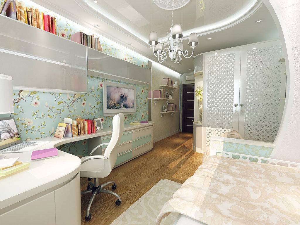 Рабочее место – важная зона в комнате подростка. Она должна быть грамотно обустроена. Устанавливается удобный стол, чтобы девушка чувствовала себя комфортно при выполнении домашнего задания. Обязательно хорошее освещение зоны. Поэтому его располагают рядом с окном. Когда нет возможности обеспечить естественное, то на рабочем столе размещается лампа.