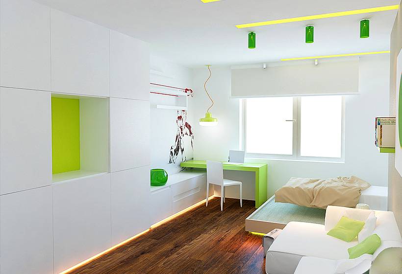 Место для занятий может стать более компактным и организованным. Ей нужно больше места для встреч с друзьями, поэтому комнату лучше зонировать, отделив визуально рабочую зону от гостевой. Сделать это стоит при помощи перепадов уровней потолка и/или освещения. Рабочее пространство можно сделать затененным, а зону для гостей осветить более ярко, расположив там потолочные светильники: вмонтированные или свисающие; одиночные или расположенные группами из 2-3 штук.