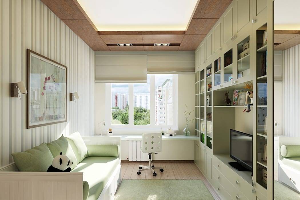 В небольшой комнате трудно выделить отдельную спальную зону. Поэтому в качестве спального места лучше выбрать раскладной диван, на который смогут присесть гости.