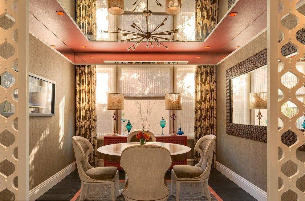 Для этого используются разные приемы. Потолок красят в яркий или тёмный цвет (часто так же декорируют и верхнюю часть стен). Также подойдут обои с крупным рисунком, потолочная плитка и т. п.