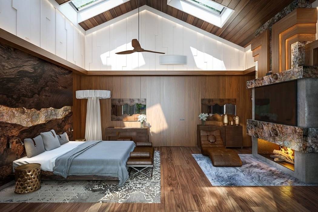 Спальня в загородном доме находится на мансардном этаже и имеет не просто высокий потолок, а ломаную крышу