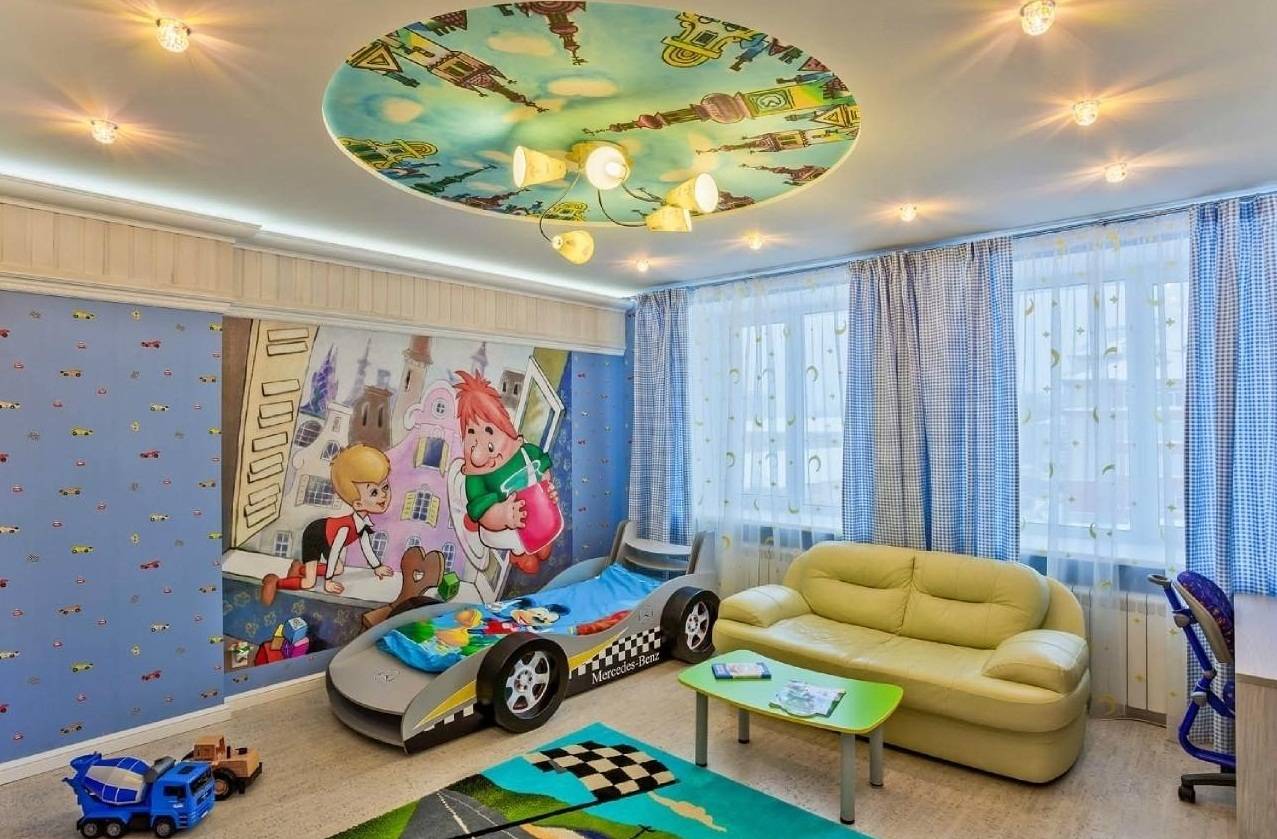 Здесь прекрасно смотрятся яркие разноцветные двухуровневые потолки. При помощи гипсокартона можно создать любые фигуры — круги, волны, солнце, облака, НЛО и другие. К тому же за счет многоярусных конструкций помещение легко разделить на зоны для сна, активного отдыха и занятий.
