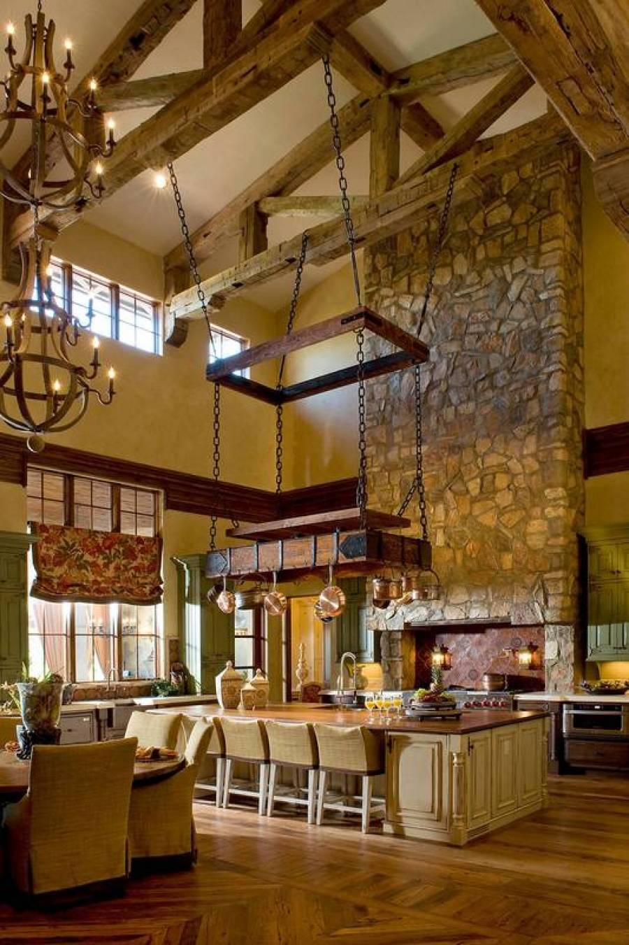 Комната в стиле кантри имеет множество тяжеловесных предметов: стол, люстра, потолочные балки. Интерьер, буквально «прорисован», толстыми контрастными линиями.