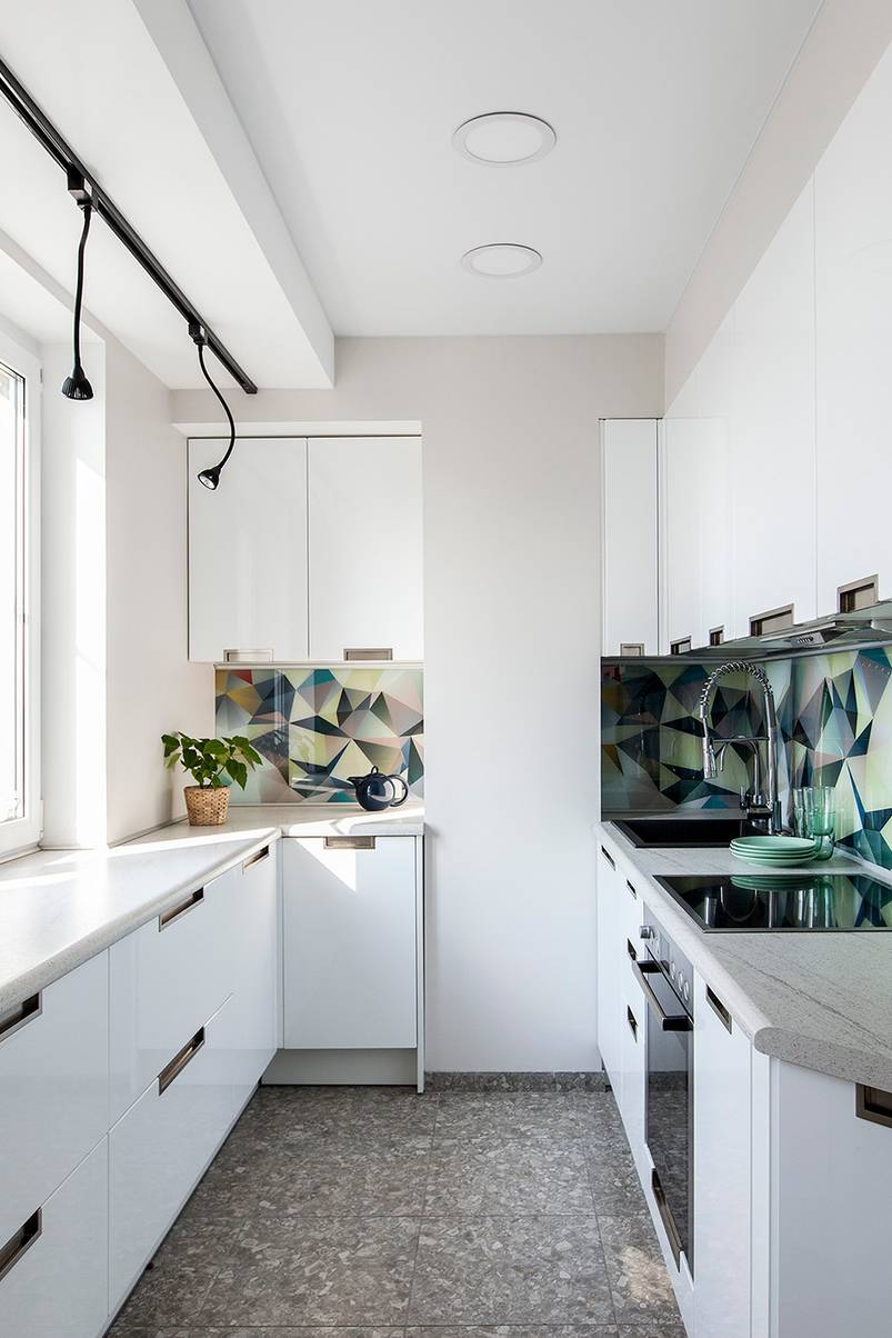 Фартук из глянцевой плитки и фасады с вставками из стекла отлично подойдут для небольшой площади.