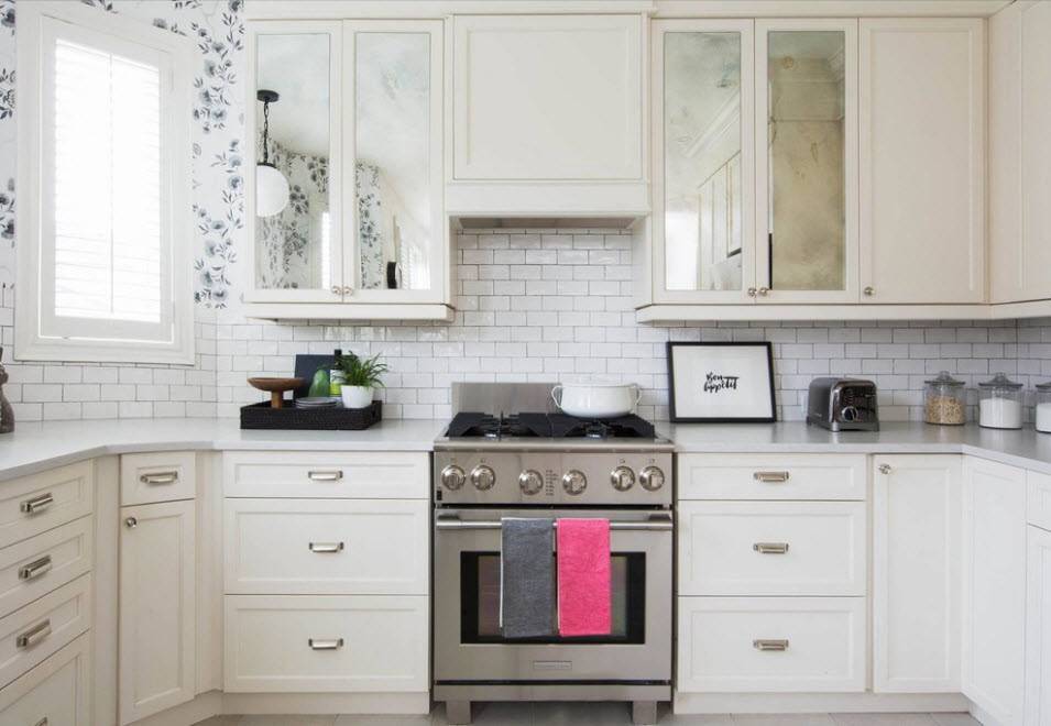 Полностью белоснежная кухня всегда будет выглядеть чистой и аккуратной. Чтобы сделать ее по-домашнему уютной, можно добавить деревянных текстур, а серые дополнения помогут облегчить процесс уборки.