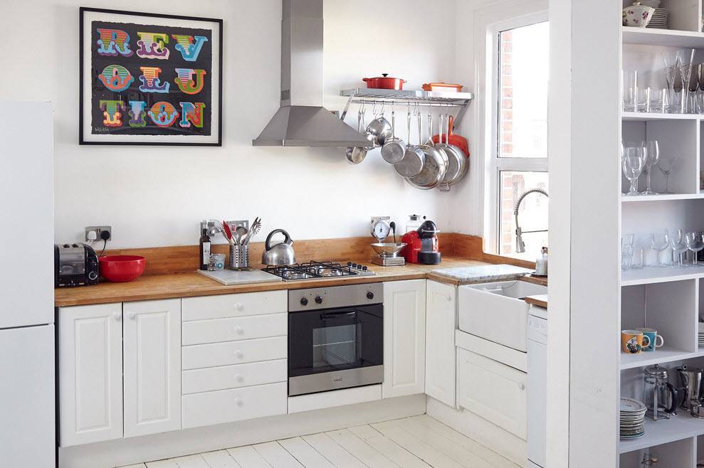 Сильный цвет на маленькой кухне – это рискованно. С другой стороны, тщательно подобранные пастельные аксессуары могут отлично разнообразить пространство маленькой кухни, если обеспечить ее равномерным белым фоном (фасады кухонного шкафа, плитка, столешница на кухне, цвет стен и освещение – обязательно белого цвета). Это романтическое и слегка ретро-решение, чрезвычайно обаятельное и требующее исключительной аккуратности при выборе аксессуаров.